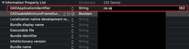 해결법은 링크에 나와있는 설명처럼 Info.plist 에 구글애드몹 사이트에 설정된 키값을 아래와 같이 넣어주면된다.